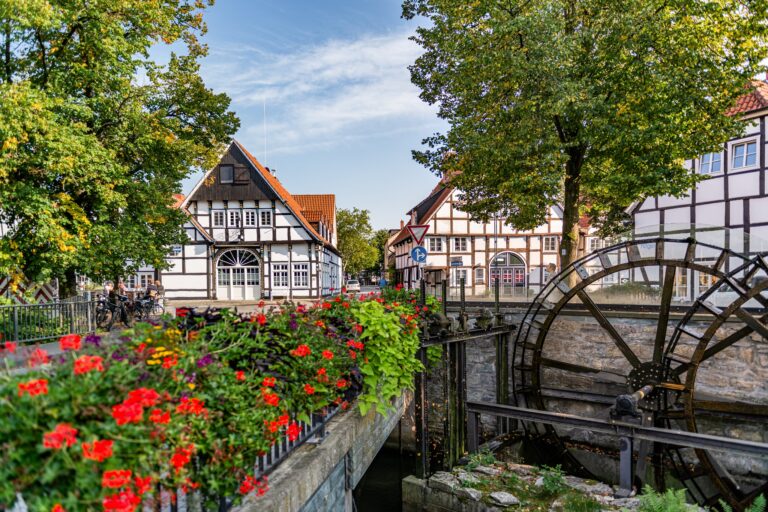 Entdecken Sie die Altstadt von Rheda-Wiedenbrück mit Fachwerkhäusern und Schloss.